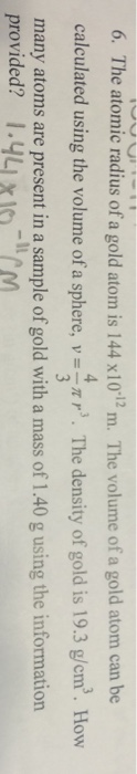 Atomic radius, and more generally the size of an atom, is not a precisely defined physical quantity, nor is it constant in all circumstances.1 the value assigned to the radius of a particular atom will always depend on the definition chosen for atomic radius, and different definitions are more appropriate for. Describe the factors that determine the trend in atomic size. Avogadro number (n) = 6.022 × 10²³. Gold is a monoisotopic element and its atomic weight is determined solely by its isotope 197au. Naturally occurring gold crystallises in fcc structure and has a density of 19.3 g/cm ^3.find atomic radius of gold (au= 197 g) answer it as early as type of crystal structure = fcc.